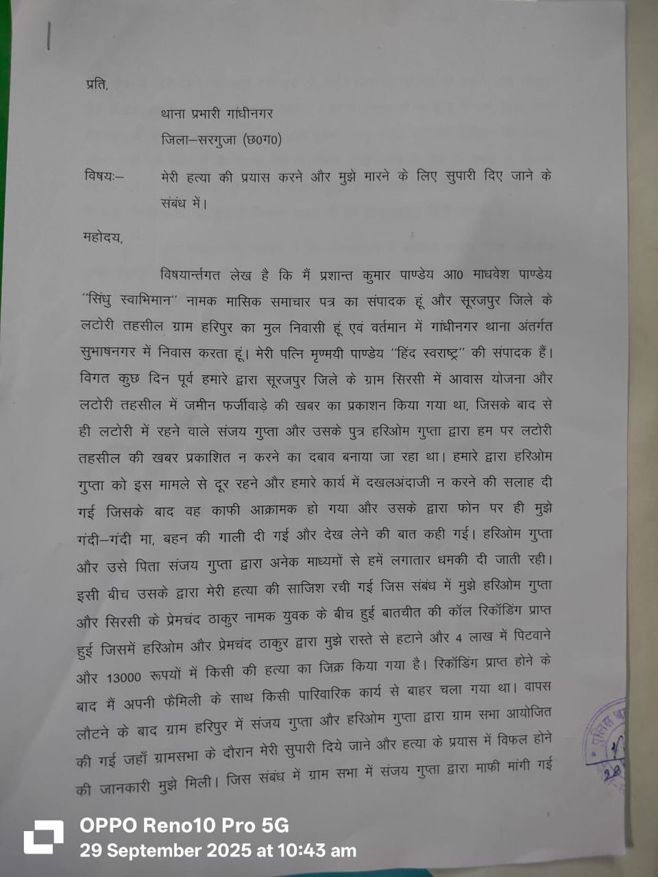 पत्रकार प्रशान्त पाण्डेय की हत्या की साजिश रचने वाले भ्रष्ट तंत्र का पर्दाफाश — आईजी सरगुजा रेंज से शिकायत, सुरक्षा की मांग