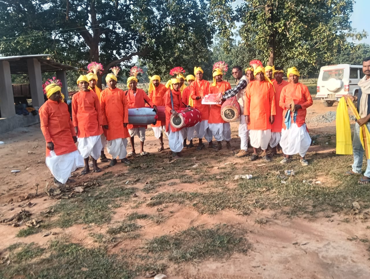 करमा नृत्य दलों को सरपंच के द्वारा दिया गया कुर्ता धोती और गमछा